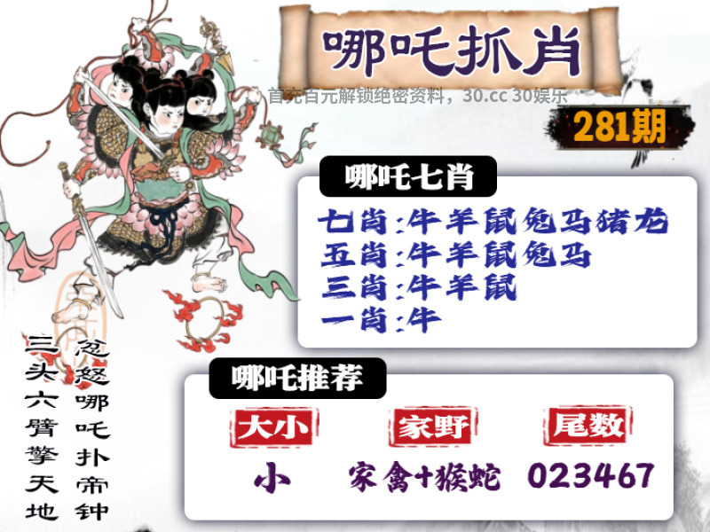 281期: ①七肖中特:牛羊鼠兔马猪龙 ③家野+2肖:家禽+猴蛇 ④精准六尾:023467 |